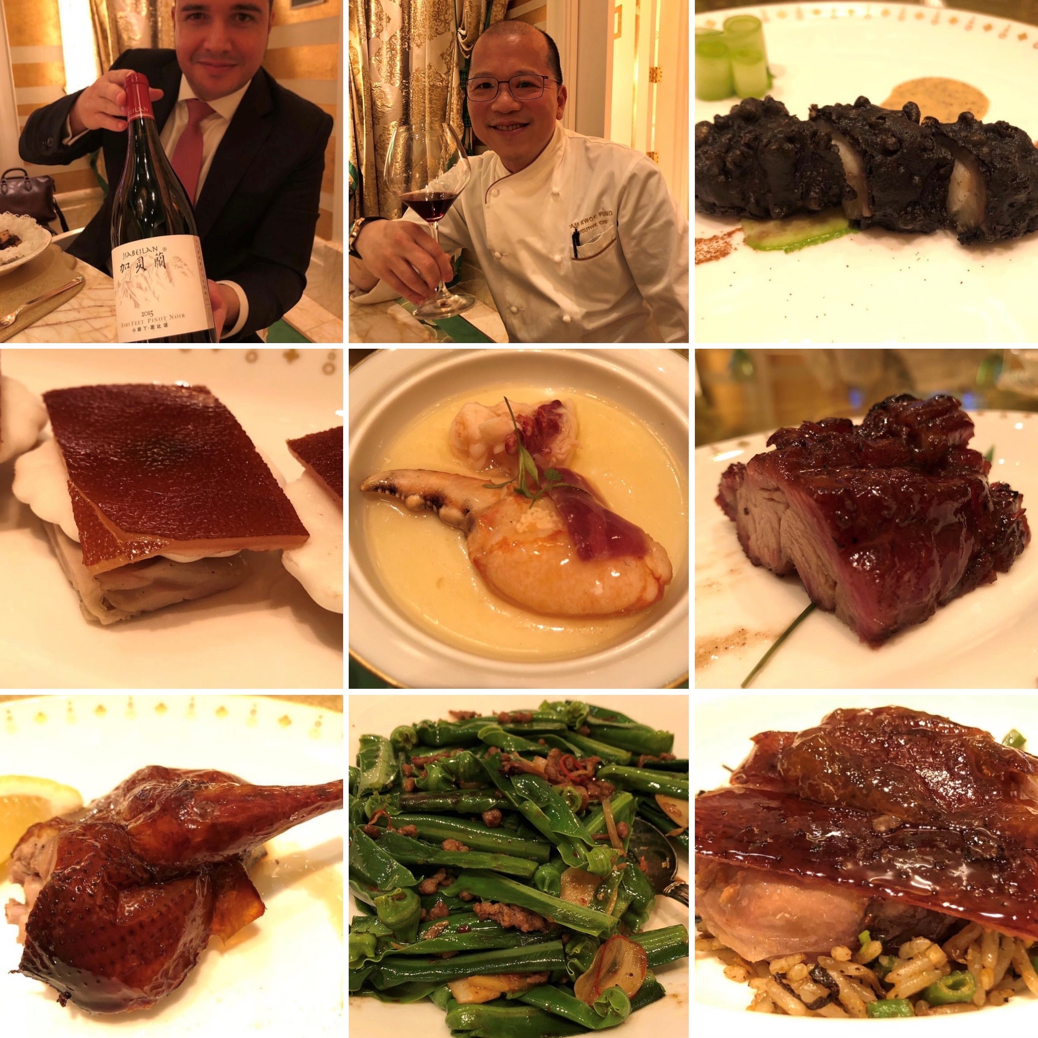 Wynn Palace. Una cena muy especial en el Casino más afamado de Macao. Pato, verduras, cerdo ibérico, pepino de mar y espardeñas. El gran descubrimiento fue Baby Feet 2015, el mejor vino chino que hemos probado. Un pinot noir que descubrió Paco Galdeano y que casi toda la producción la compra en exclusiva Wynn Palace.
