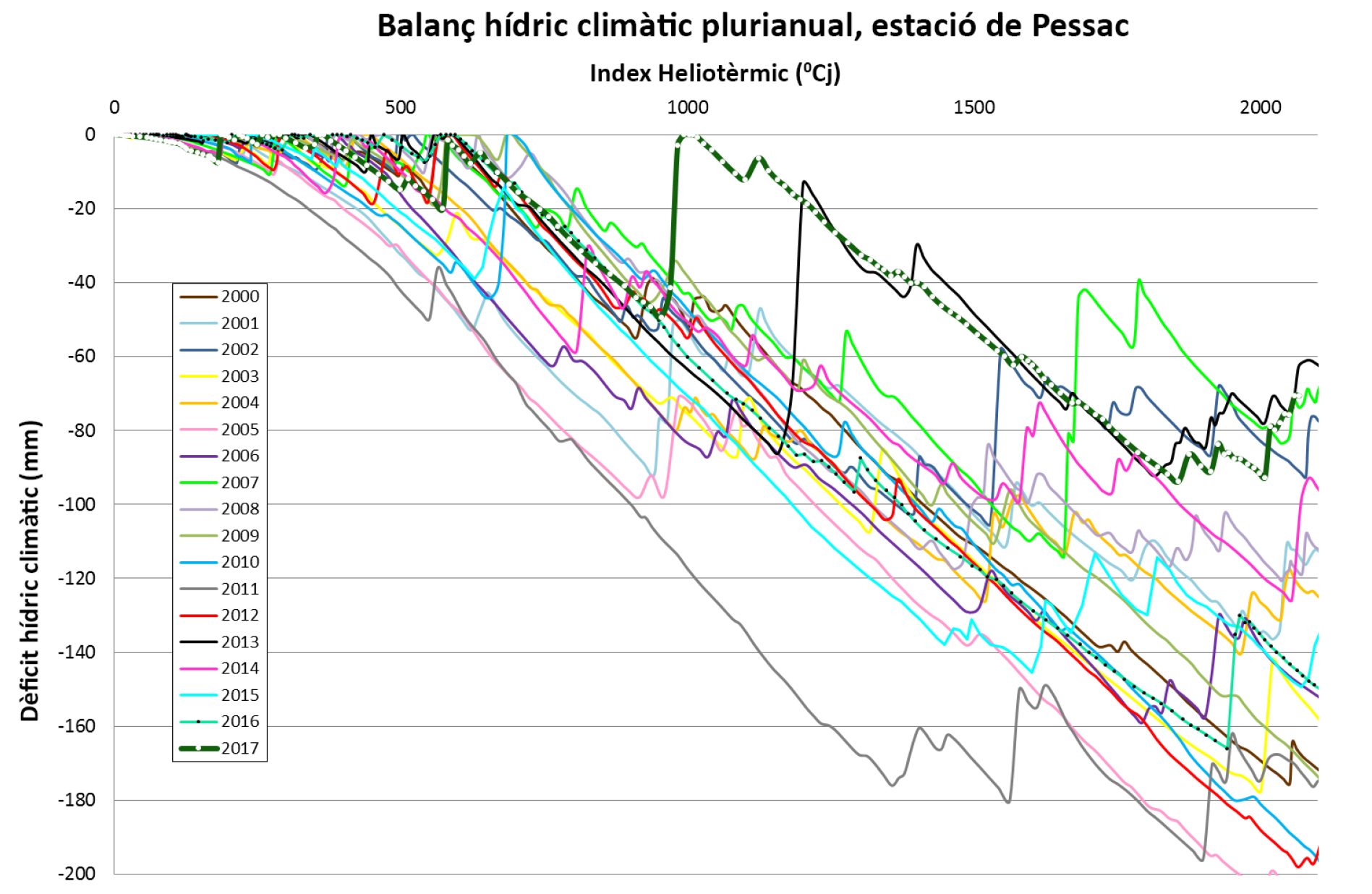 El balance hídrico-climático pone en evidencia la contrastada dinámica hídrica del 2017, con una primavera más bien seca sin alejarse demasiado de la media, un episodio muy lluvioso cercano al cerrado del racimo (entre 66 y 15 mm de precipitaciones entre el 15 y el 30 de junio según el observatorio) seguido de un verano seco. No obstante, el balance hídrico-climático a partir del 1 de abril no contabiliza el déficit hídrico real que sufrieron las viñas antes del cerrado del racimo y en la fase de maduración (próximo a los registrados en 2005, 2010 y 2012, pero inferior a los del 2016).