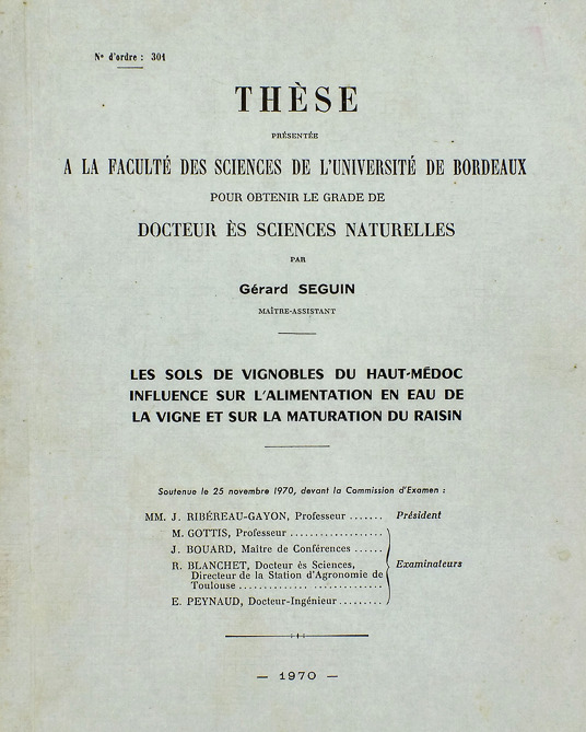 Més endavant, al seu laboratori, J. Duteau, K. Van Leeuwen, E. Boissenot, O. Tregoat i X. Choné van seguir el camí traçat per Seguin, demostrant l’efecte de la disponibilitat en aigua dels sòls sobre la fisiologia de la vinya, el rendiment, les aromes, la qualitat tànnica del raïm, …