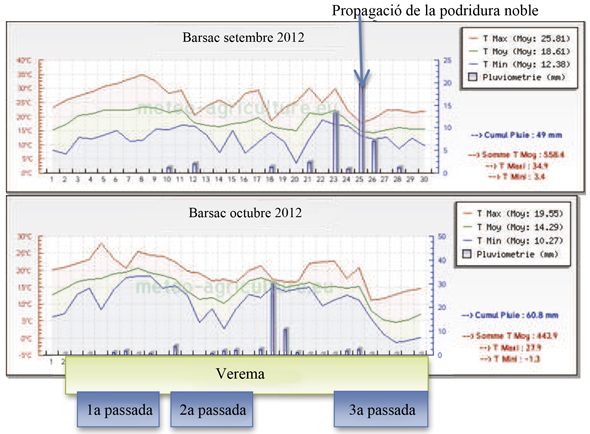 Figura 11: Precipitacions i temperatures a Barsac al setembre-octubre: propagació i progressió de la podridura noble, i un exemple d’una parcel·la a Barsac