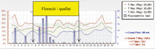 Desafortunadament, la floració durant la primera setmana de juny va ser acompanyada per un clima fred i humit que no conduïa a la fertilització (figura 1). Les varietats de raïms sensibles (merlot, sauvignon blanc i cabernet franc), per tant, van patir en diferents graus. Com sempre, les velles vinyes i, en conseqüència, freqüentment infectades per virus van patir les majors pèrdues en els cultius. El punt mig de la floració va tenir lloc el 12 de juny, és a dir, al voltant de deu dies més tard que la mitjana de 1999-2009 (2 de juny). El quallat de la fruita va tenir lloc sense el menor estrès d’aigua.