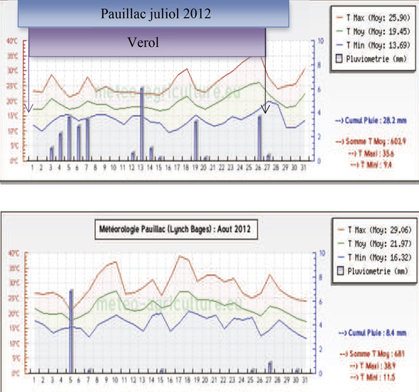 Figura 2: Temperatures i precipitacions al juliol/agosto 2012 a Pauillac