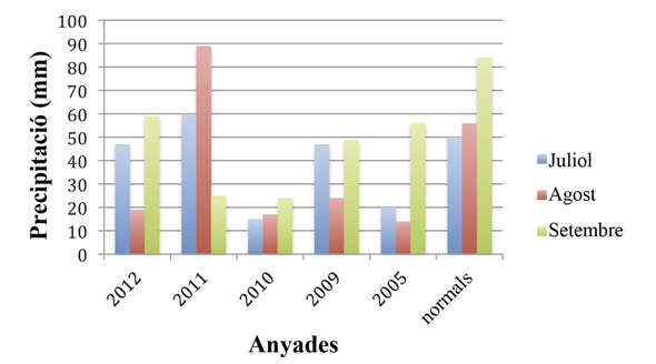 Figura 3: Precipitacions de juliol a setembre de 2012, 2011, 2010, 2009 i 2005