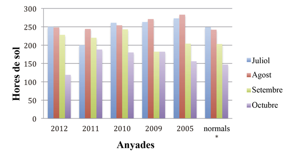 El clima va canviar abruptament a partir del 25 de setembre, quan el bell estiu va donar pas a una tardor primerenca i humida. L’octubre del 2012 va ser més plujós i menys assolellat del normal (figures 7 i 8). Les pluges més importants van caure els dies 18, 19 i 20 del mateix mes.