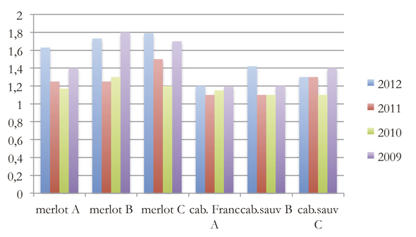 Els raïm de cabernet del 2012 eren comparables en grandària als de 2009, però més que el 2010 i 2011. El seu contingut de sucre, similar al 2010, també va ser major que el 2011. No obstant això, hi havia un contingut significativament major d’àcid màlic al cabernet 2012 en comparació amb altres collites recents. El seu contingut d’antocianines va ser similar al del 2009, però inferior a 2010 (gràfic 10). Alguns raïms de cabernet al 2012 (sauvignon i franc) van mostrar un caràcter herbaci en diferents graus ja que el seu contingut en metoxi isobutil pirazina estava per sobre el llindar de percepció. Això fou conseqüència de: la llarga i dispersa floració i verol durant una primavera humida, que va bloquejar la maduració a causa de la sequera estival prolongada, una càrrega massa pesada en la collita, una poda tardana o inadequada i la verema en verd insuficients per eliminar els raïms de maduració tardana en el moment adequat. No obstant això, seria un error considerar que tots els cabernet 2012 van ser herbacis. Encara que molts d’ells van ser afectats per aquest defecte olfactiu.