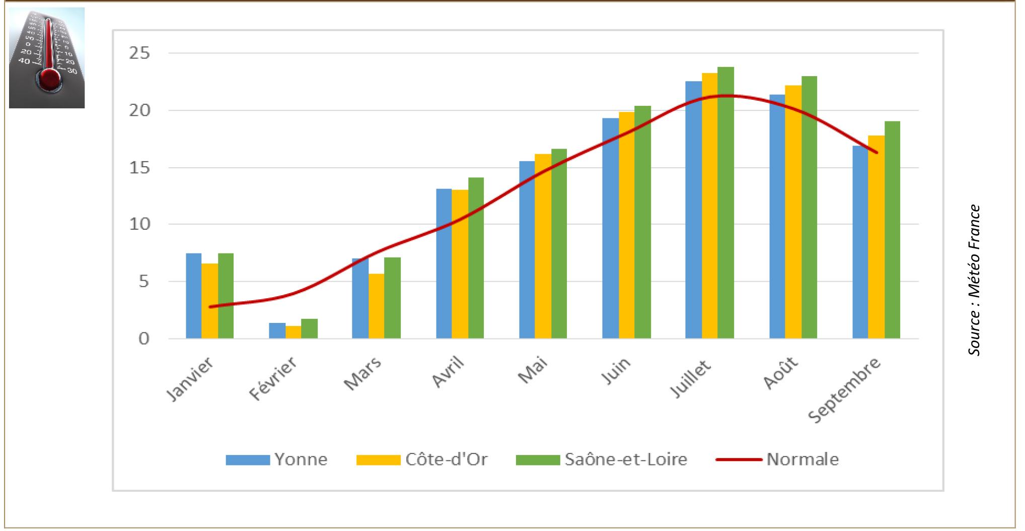 Al juliol, agost i setembre es van registrar temperatures molt superiors a les mitjanes estacionals, amb un període canicular. La pluviometria va ser molt deficitària i només la Côte-d’Or es va beneficiar d’algunes precipitacions localitzades al juliol. Els episodis de calamarsa van tenir un lleuger impacte a les vinyes, sobretot als voltants de Nuits-Saint-Georges.
