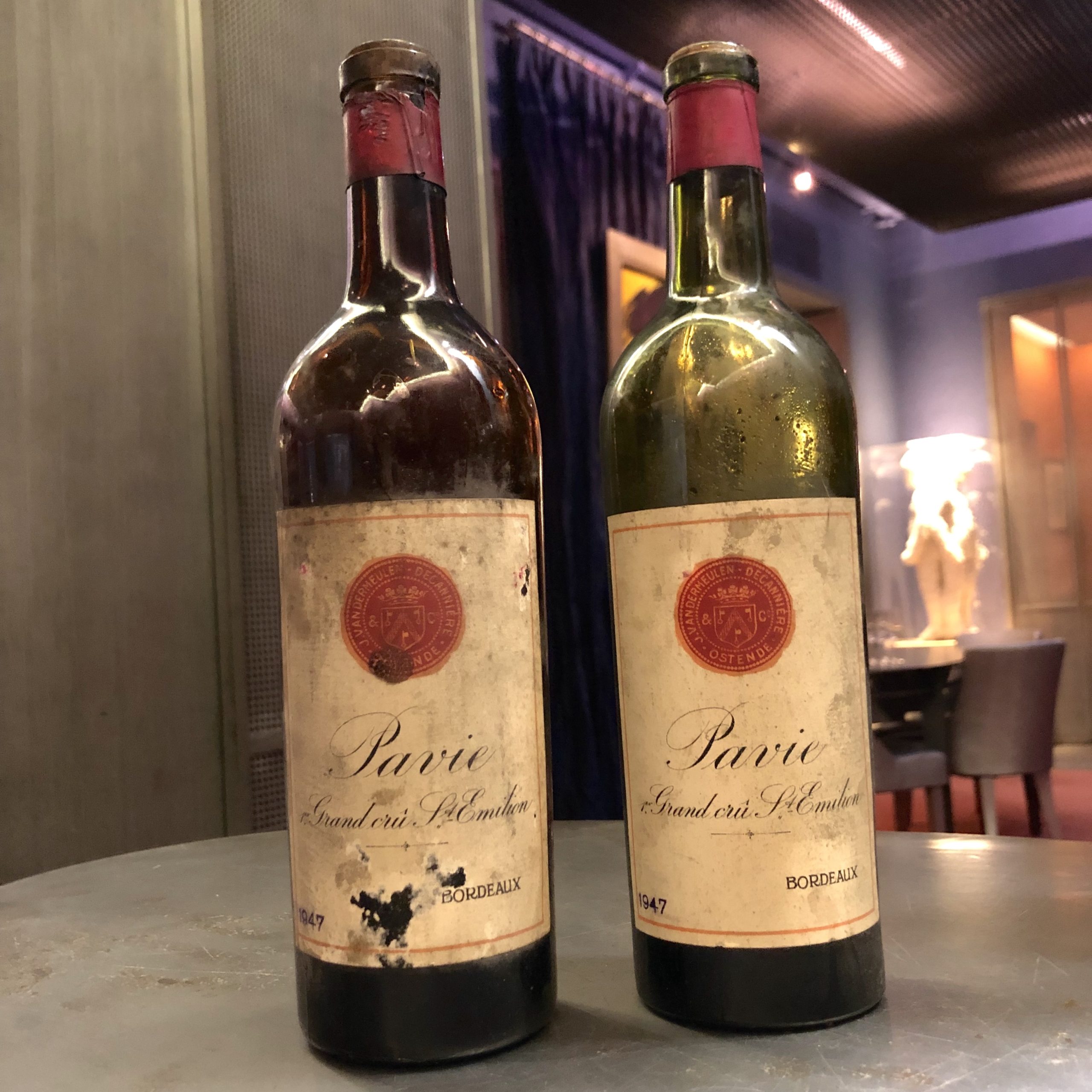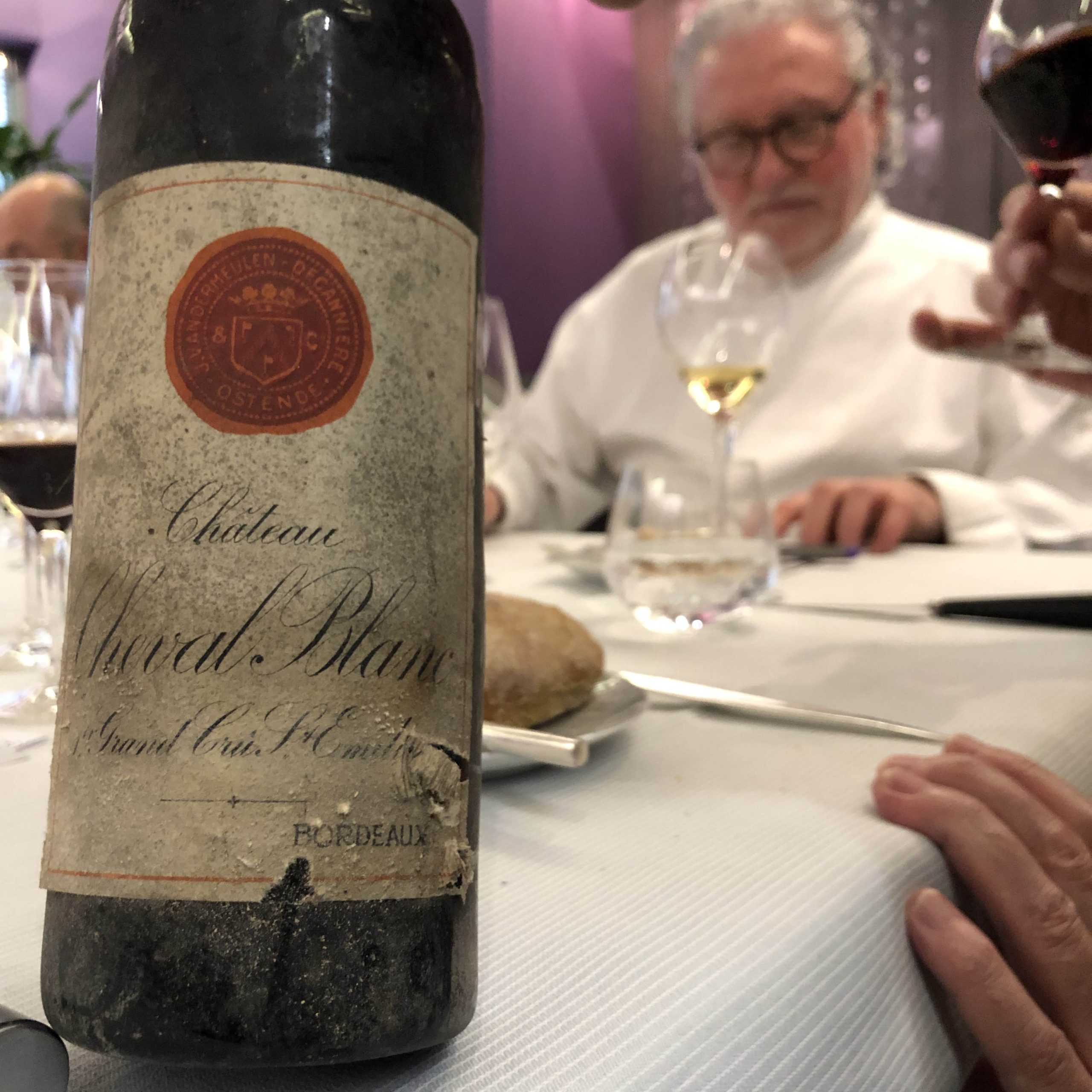 Així doncs, és d’entendre, que en vins d’aquells anys hi hagi molta diferència de qualitat entre dues ampolles de la mateixa collita i del mateix château segons la seva procedència. Les ampolles del menjar havien estat embotellades a Bèlgica per J. Vandermeulen i el seu estat de conservació era impecable. El gran crític francès –que havia tastat Château Cheval Blanc 1947 embotellat al château– assegurava que aquestes dues ampolles estaven molt millor que les embotellades al château que tenien la volàtil molt alta.