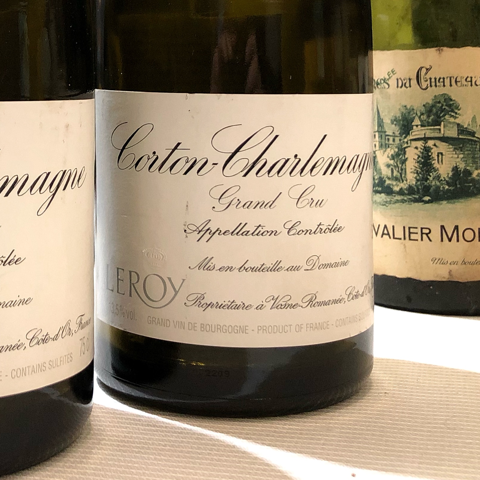 Grandioses ampolles de Domaine Leroy Corton-Charlemagne Grand Cru 2011, per sobre del també desitjat Corton-Charlemagne de Coche Dury.