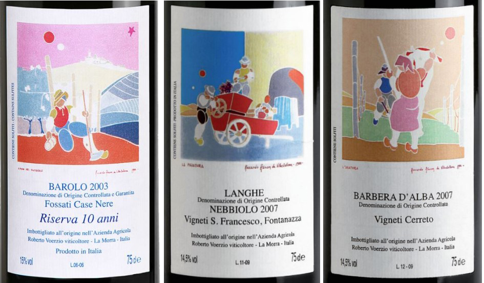 • Un aspecte visual coherent i llegible: etiqueta, logotip, tria de tipografia identitària, caixes, taps… El celler d’en Roberto Voerzio de Barolo a La Morra ha aconseguit crear una identitat molt forta amb il·lustracions en colors pastís a les seves etiquetes.