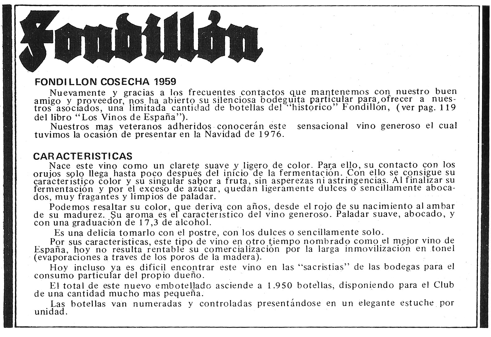 A continuació, es detalla la forma d’elaborar el Fondillón als pobles propers a Alacant capital. Segons la revista VINOCUB de gener del 1979, un butlletí editat per CLUVE “Club de Selecció de Vins”, revista dirigida per José Peñín, Mª Isabel Mijares i assessorat per Gonzalo Sol de Liaño.