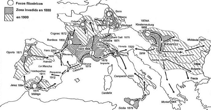 La fil·loxera, com ja sabem tots és un insecte que s’alimenta de les arrels de les vinyes i que destruí vinyes de zones vitícoles de tota Europa. Es detectà a França cap el 1870 i s’anà expandint com dèiem per Europa.