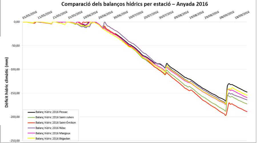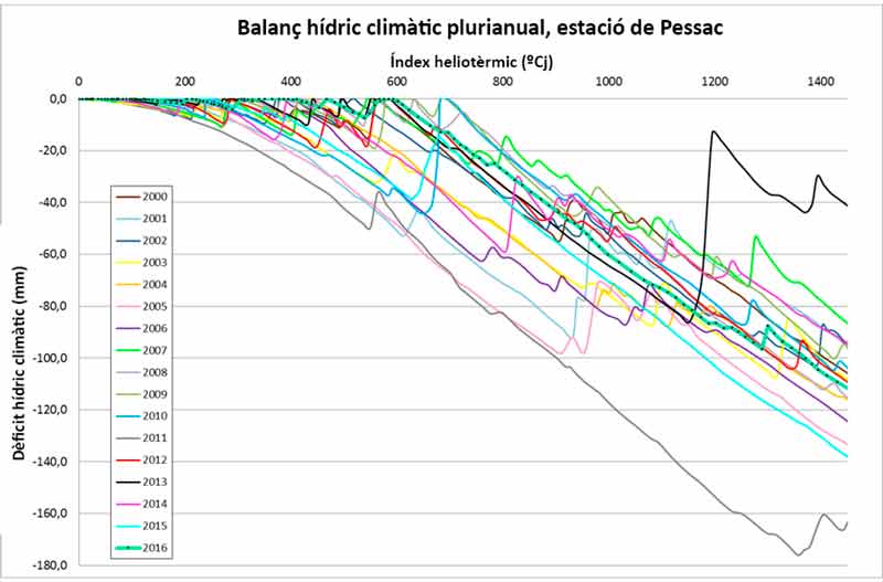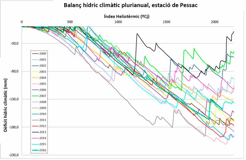 L’únic punt feble del 2016 és el dèficit hídric, localment excessiu, que van patir les vinyes en les zones més seques, agreujat per les altes temperatures nocturnes donades a finals d’estiu. Però les regions que han patit aquests problemes de blocatge són minoritàries i no haurien d’enterbolir la tendència hídrica positiva que han tingut la majoria de parcel·les.