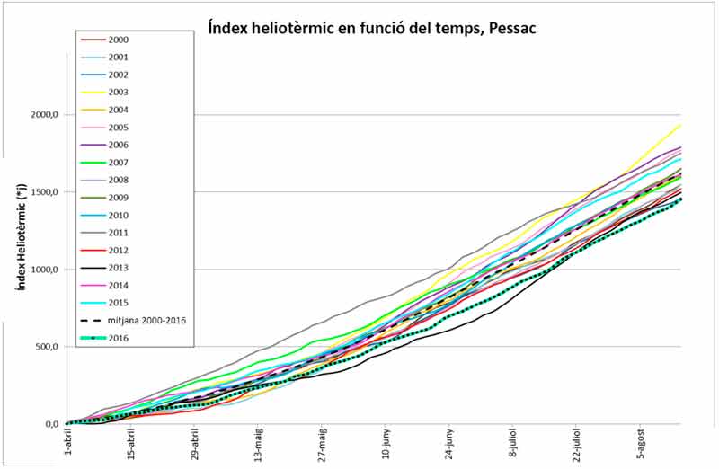 L’índex heliotèrmic, particularment indicatiu per apreciar la precocitat de les diferents anyades, confirma el caràcter tardà del 2016, pròxim al 2001 i 2012, lleugerament més precoç que el 2002, 2008 i 2013. Si tenim en compte que la càrrega tànnica és més important aquest any que al 2012, sembla evident no voler córrer massa i conservar la data d’inici de veremes del 2012 com a punt de referència per aquest any. Les veremes que haurien de començar cap els últims dies de setembre en els sectors més precoços es pronostiquen serens amb unes condicions climàtiques favorables.