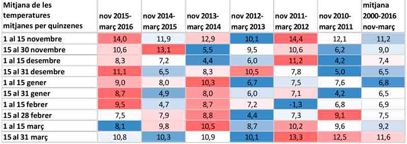 Les temperatures mitjanes per quinzenes des de l’1 de novembre confirmen el pronòstic d’un hivern excepcionalment suau amb unes temperatures mitjanes entre l’1 de novembre del 2015 i el 28 de febrer del 2016 superiors en 1,9ºC respecte a la mitjana 2000-2016 de les temperatures mitjanes en aquest mateix període.