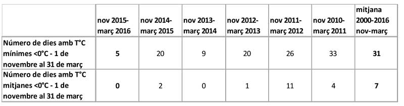 Taula 2: comptabilització del número de dies amb gelades (diürnes i nocturnes) des de l’1 de novembre al 31 de març