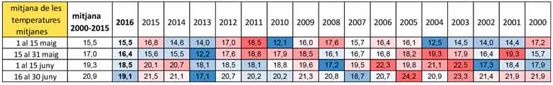 Taula 4: Mitjana de les temperatures mitjanes per quinzenes de l’1 de maig al 30 de juny