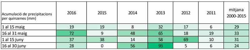 Taula 5: Acumulació de les precipitacions per quinzenes des de l’1 de maig al 30 de juny