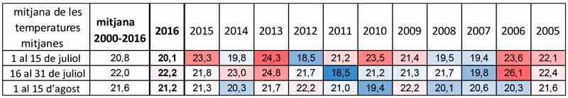 Taula 9: Mitjana de les temperatures mitjanes per quinzenes des de l’1 d’agost al 30 de setembre (26 de setembre pel 2016)
