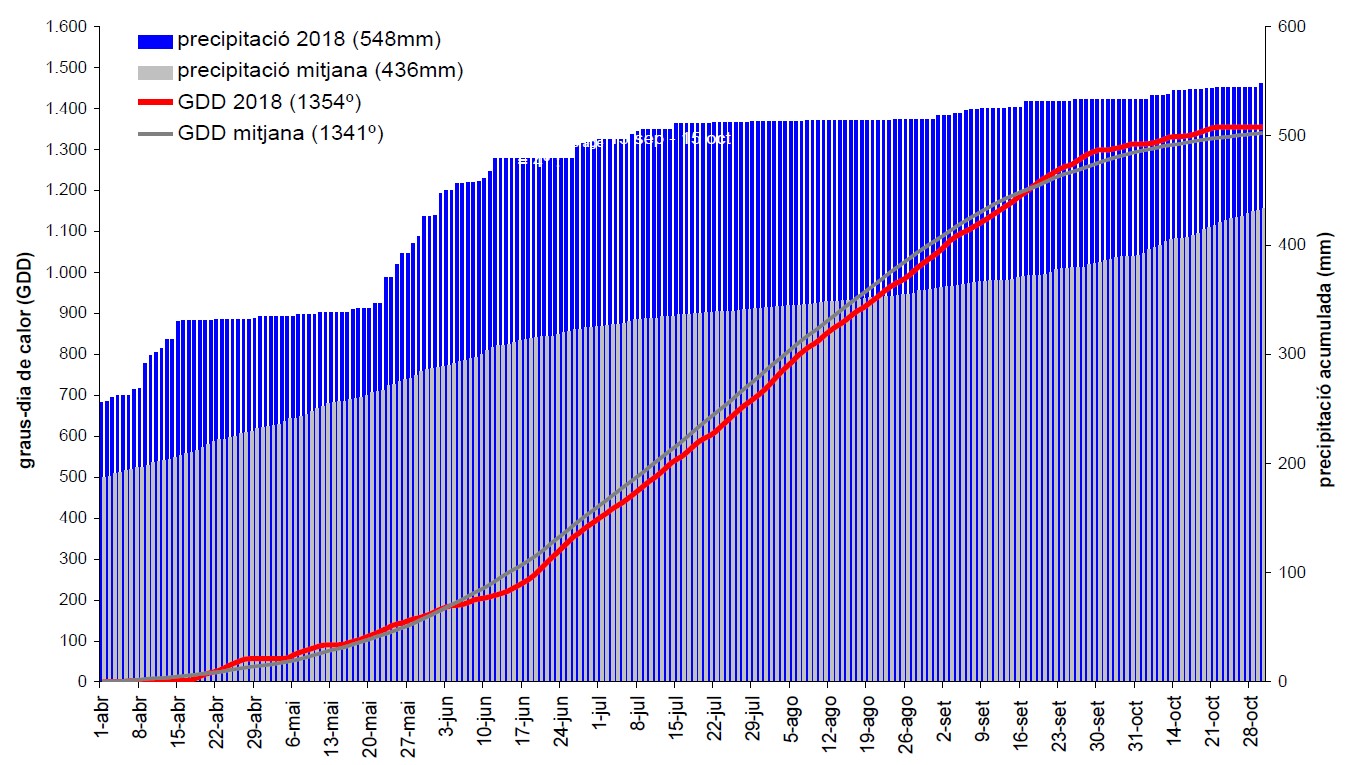 Les reserves d’aigua acumulades a la sortida de l’hivern van ser importants. Les precipitacions durant el cicle vegetatiu van ser superiors a la mitjana, acumulant-se durant tota la primavera. La resta del cicle va ser relativament sec.