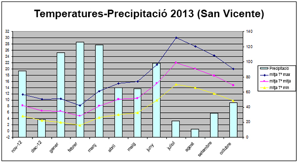 Els mesos d’hivern van ser frescos, amb gran quantitat de pluges i lleugeres nevades, que juntament amb l’aportació de les pluges de tardor, van deixar més de 500 l/m2 als nostres sòls, incrementant la reserva hídrica abans del cicle vegetatiu. Al començament de la primavera es produeixen unes intenses pluges que anirien acompanyades de baixes temperatures, endarrerint totes les feines del sòl i el desenvolupament del cicle vegetatiu.