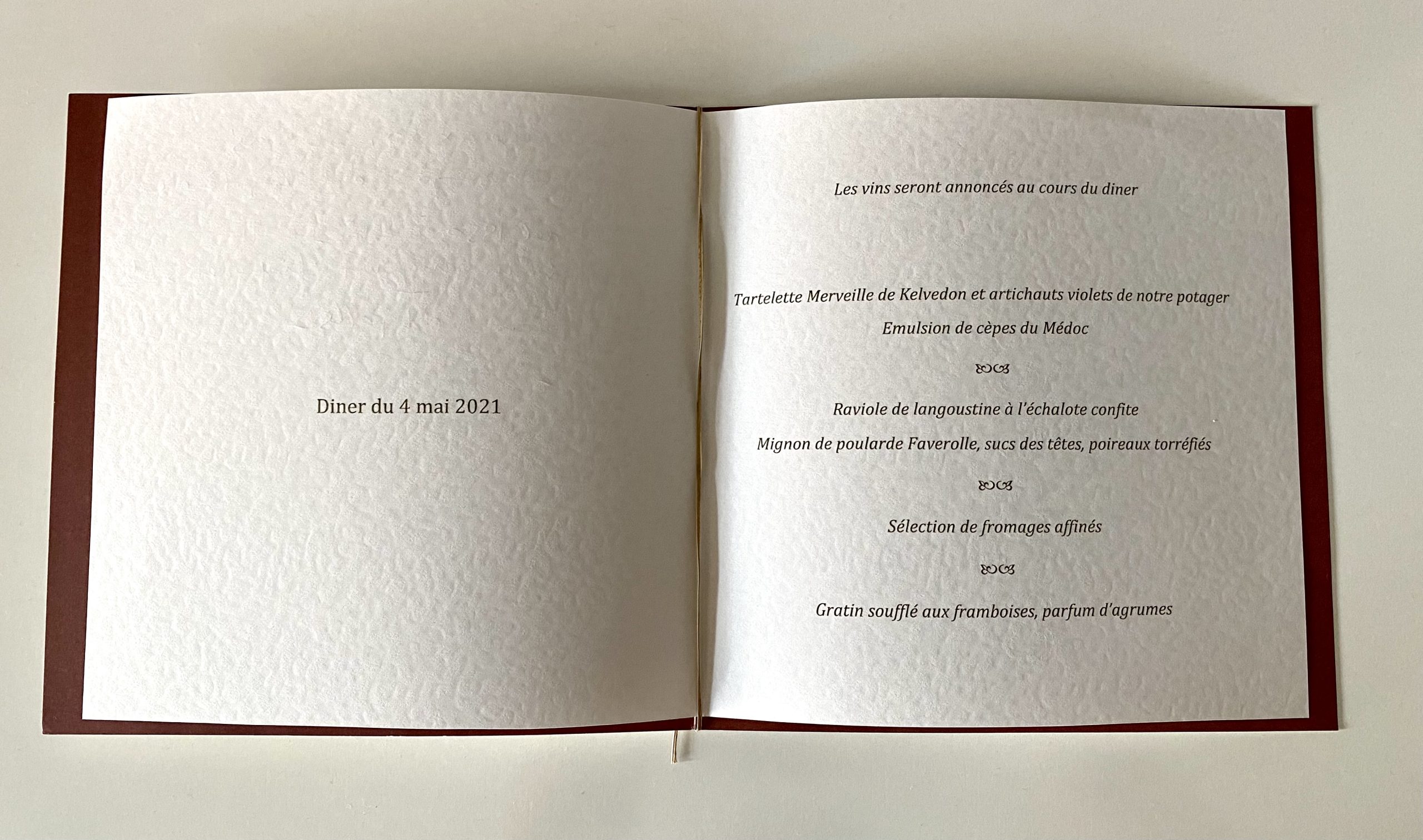 Els tasts del Frédéric sempre segueixen un fil. Li agrada servir els vins a cegues i que hi hagi un tema concret, com pot ser la varietat, l’edat o les anyades. Sovint la successió d’anyades no té una aparent lògica d’edat o d’intensitat, però la muntanya russa s’adapta com un guant als plats i segueix una cadència com una òpera organitzada en diferents actes. El tema dels vins del sopar era desconegut i, per descomptat, les anyades de les ampolles. El menú el va preparar el xef del château i els vins varen ser oberts i servits també per persones molt experimentades del seu equip.