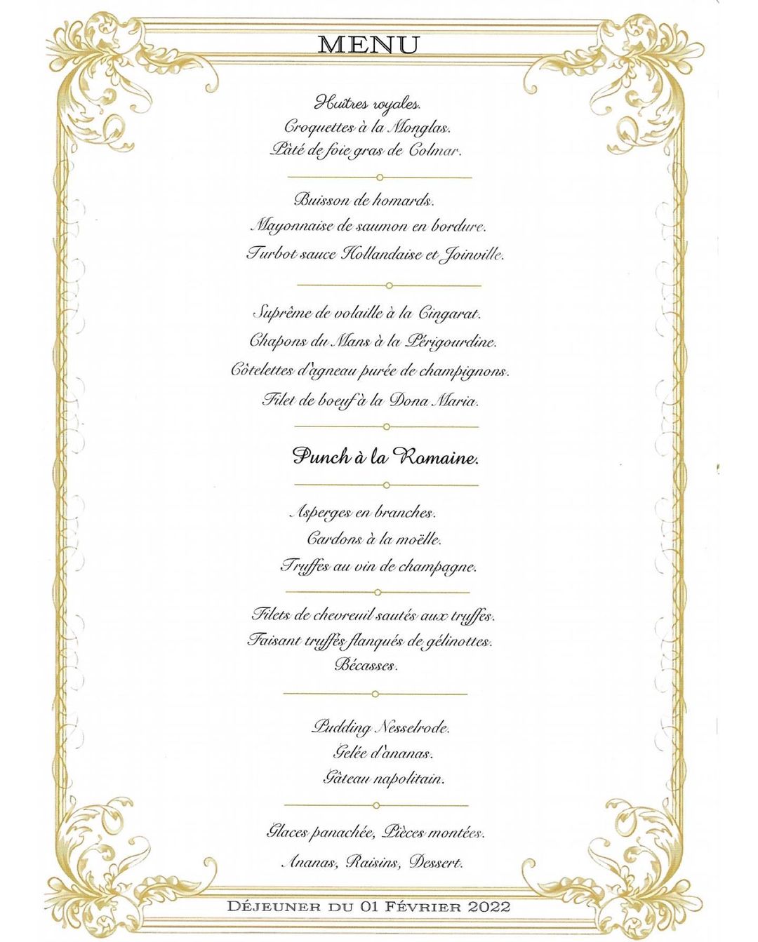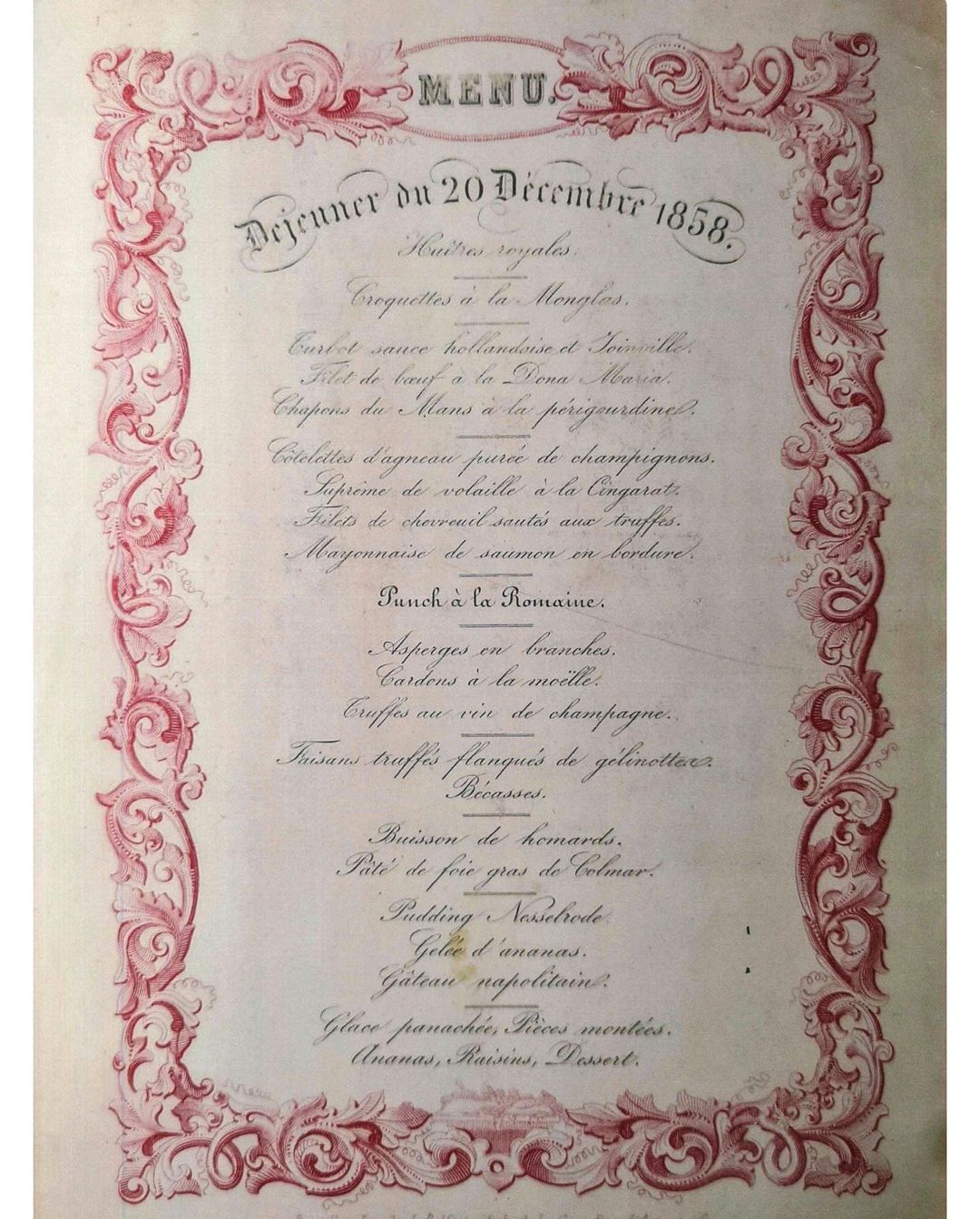 EL MENÚ ORIGINAL DEL 20 DE DICIEMBRE DE 1858